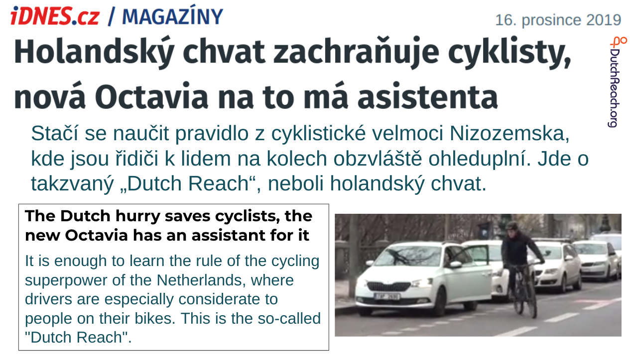 ... The Americans gave us dooring , and they now give us the antidote: the Dutch grip. Perhaps also the Dutch grasping. Anyway, the dutch reach . I happened to find it on the net in a design and architecture podcast . Meanwhile there is even a website to the dutch reach .