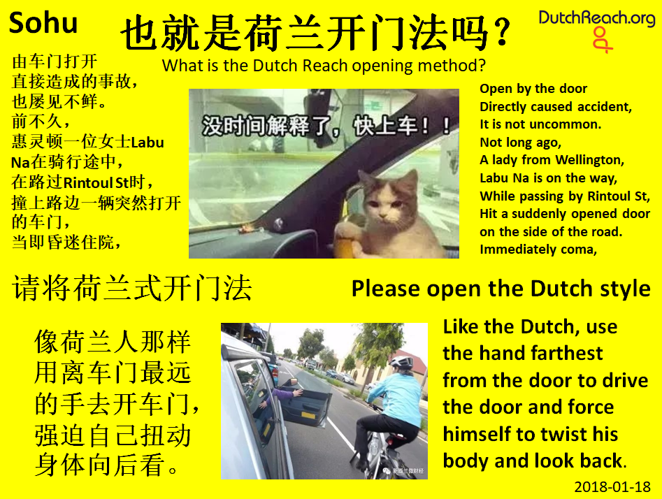 Chinese language blog post on the Dutch Reach method to avoid car dooring crashes with bicyclists, motorcycles & moped or other vulnerable road users. New Zealand door collision & far hand technique reported.