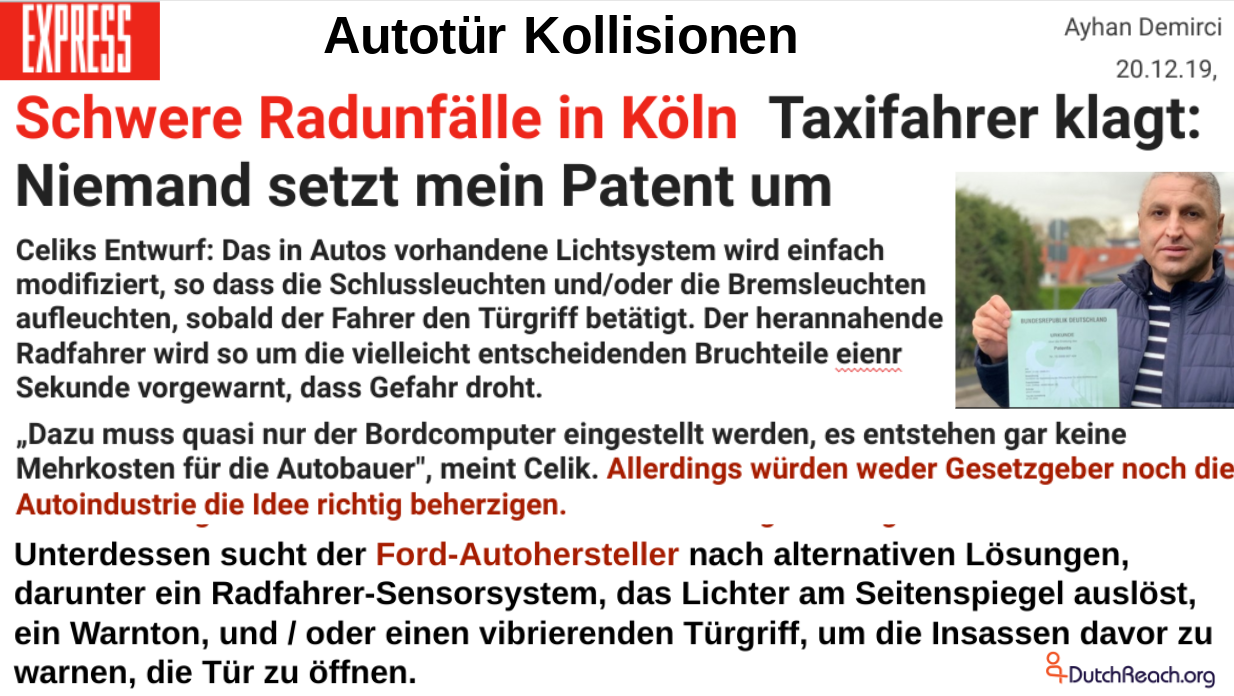 Cologne taxi driver patents door opening alert system to warn cyclists tying door lever operation to exterior lights and interior vibratory alerts. Ford studies sensor-based solutions for doorings. By Ayhan Demirci, EXPRESS, 12/20/19, Cologne .de. [Original article in German. Use Google Translate.] Click image to enlarge.